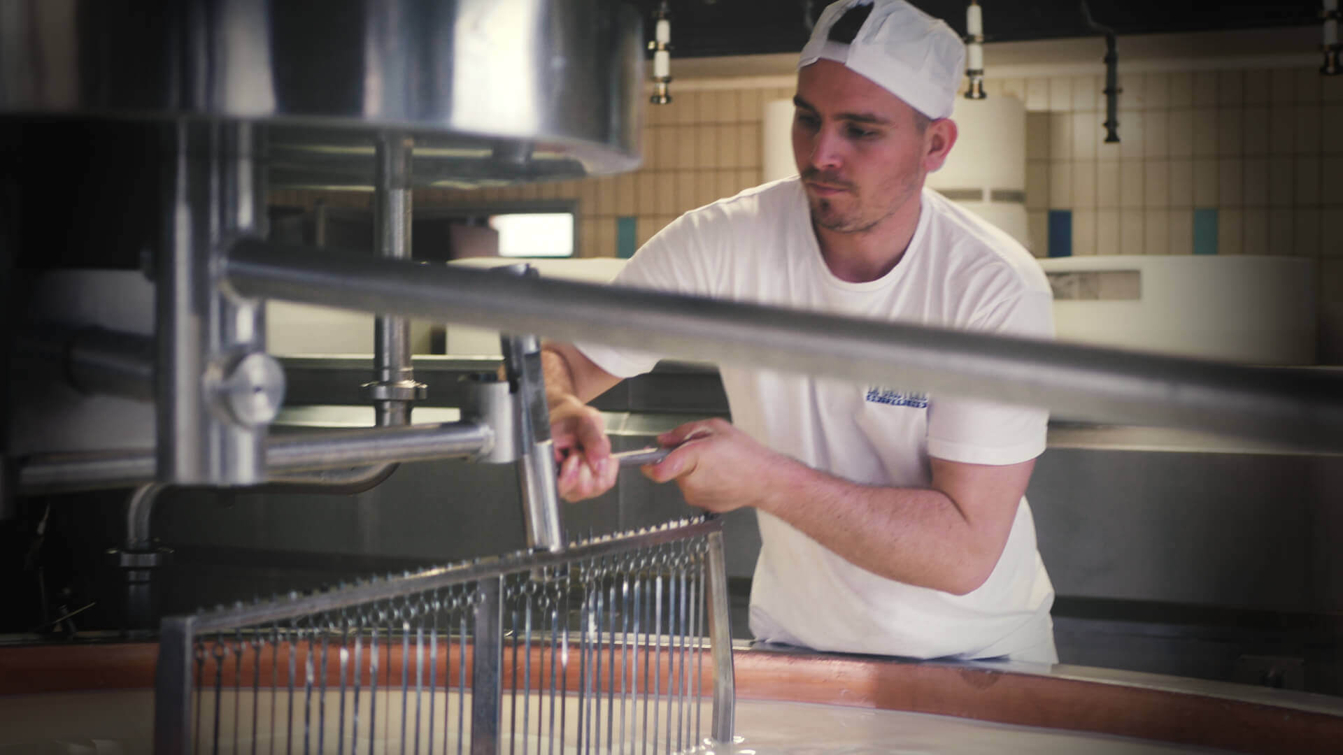 Chaque jour, 18 meules de Gruyère prennent forme dans notre fromagerie grâce au lait frais de nos 10 producteurs locaux. Un travail d’équipe et de passion qui perpétue le savoir-faire traditionnel tout en valorisant la richesse du terroir de notre région.